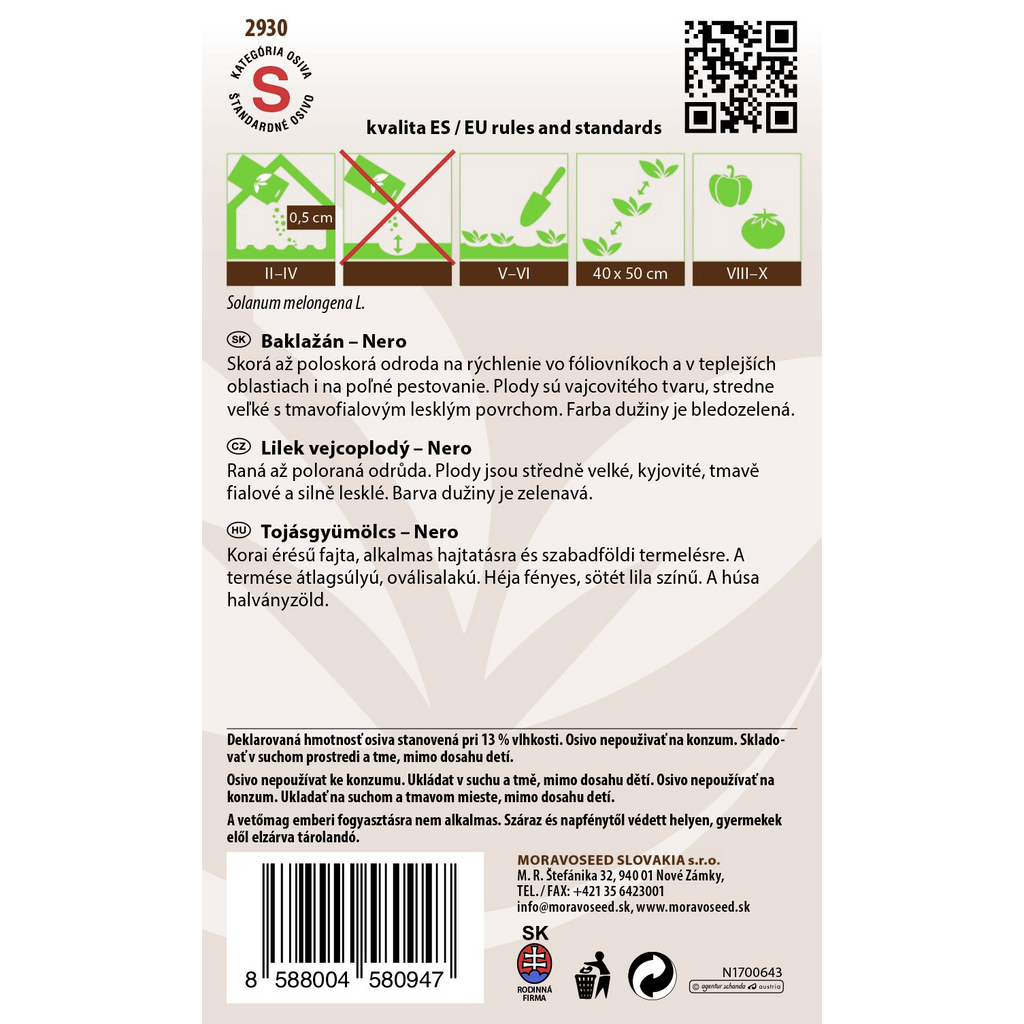 Äggplanta Nero är en tidig och lättodlad sort som ger vackra, ovala frukter med djup mörklila färg och glänsande yta. Det ljusgröna, milda fruktköttet gör den utmärkt till allt från grillade skivor till gratänger och medelhavsrätter.