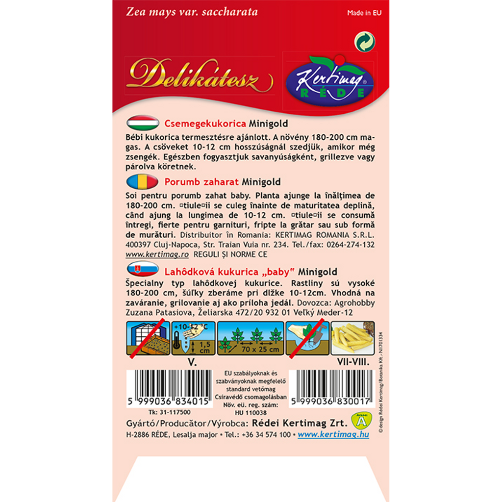 Babymajs Minigold (Zea mays) är en bebismajs som skördas när kolvarna är 10–12 cm långa. Denna sort är idealisk för inläggningar eller grillad som ett utmärkt tillbehör. Plantorna når en höjd av 100–120 cm och producerar 4–5 kolvar per planta. Skördas i ett tidigt, spädt stadium när kornen är grön-gula, vilket gör den perfekt för användning i sallader, sidorätter eller som en smakrik snack.