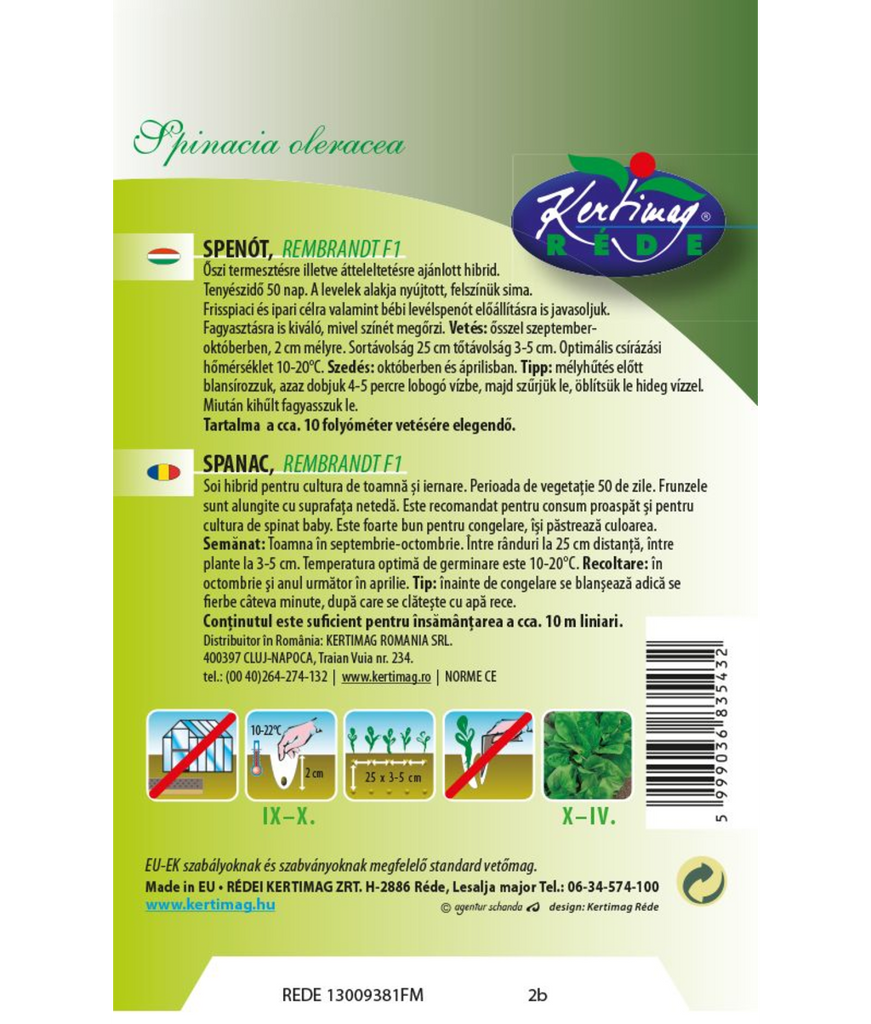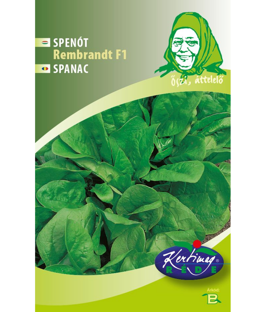 Babyspenat Rembrandt F1 (Spinacia oleracea L.) är en modern spenathybrid som är särskilt framtagen för höstodling och övervintring. Med en kort utvecklingstid på cirka 50 dagar ger den snabbt skördeklara, avlånga blad med slät bladytan, perfekt anpassade för både baby leaf-produktion och fullvuxen spenat.
