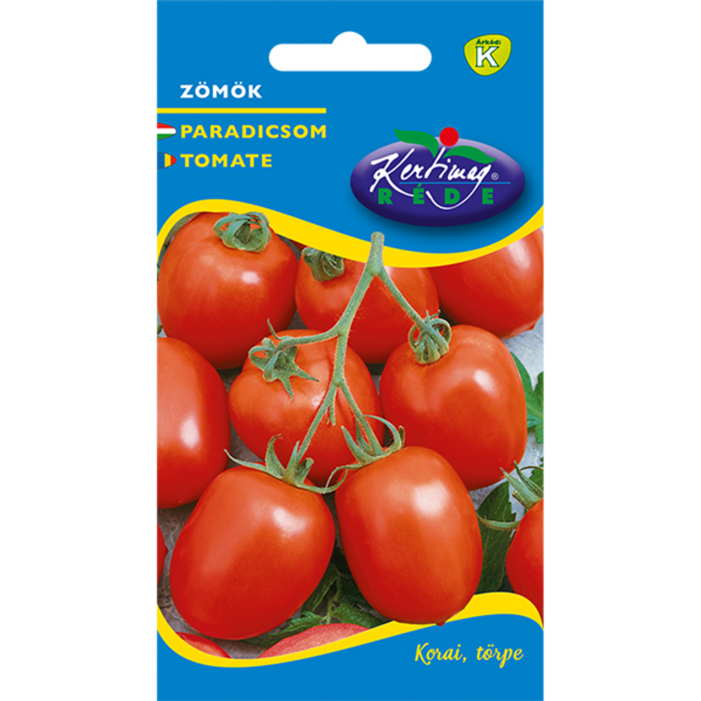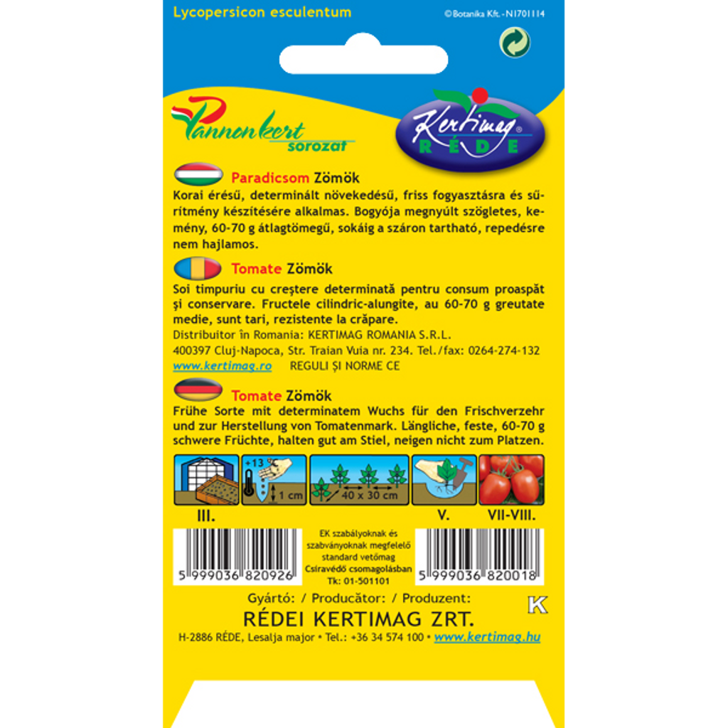 Balkongtomat Zömök (Solanum lycopersicum L.) är en lågväxande, determinant tomatsort med tidig mognad, vilket gör den perfekt för små utrymmen som balkonger eller terrasser. De avlånga och cylindriska tomaterna väger mellan 60–70 g och har en fast och hållbar konsistens, vilket gör dem utmärkta för både färsk konsumtion och tillverkning av tomatpuré. En annan fördel med denna sort är dess förmåga att hålla tomaterna på plantan utan att spricka, vilket gör den lättskött och pålitlig för långvarig skörd.