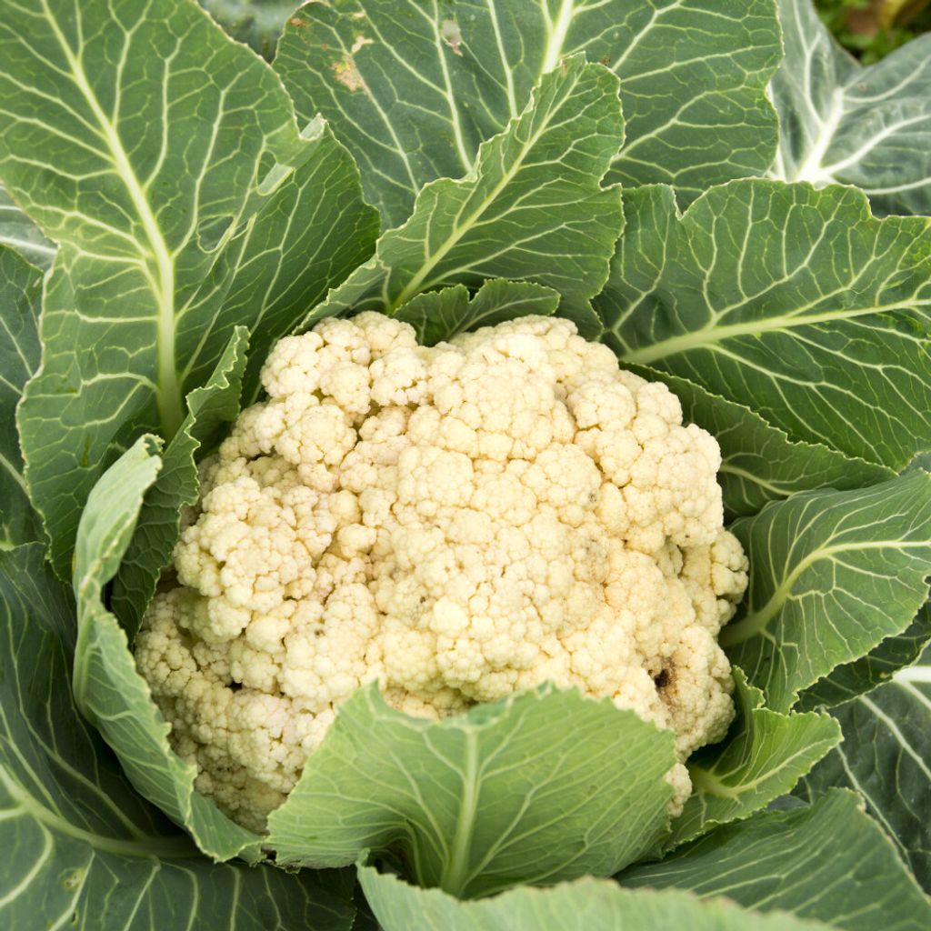 - Egenskaper: Medelstora, snövita blomkålshuvuden, väl skyddade av blad