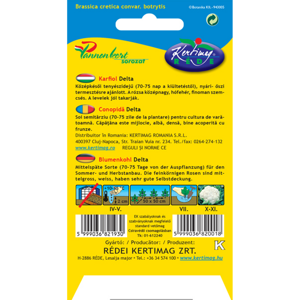 Blomkål Delta (Brassica oleracea convar. botrytis) är en medelsen sort som har en växttid på 70–75 dagar efter plantering. Den är perfekt för både sommar- och höstodling och producerar medelstora, snövita blomkålshuvuden med en fin struktur. Bladen täcker huvudet väl och skyddar det under tillväxten, vilket säkerställer både hög kvalitet och ett attraktivt utseende.