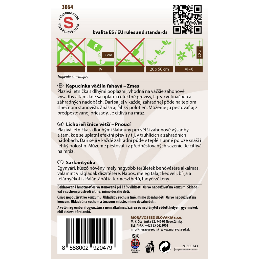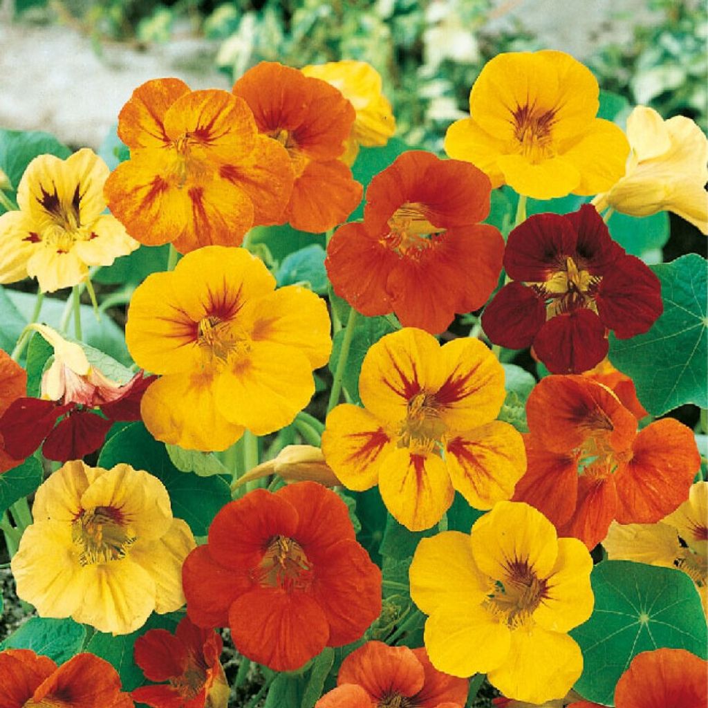 Buskkrasse Larger Capuchin (Tropaeolum majus) är en snabbväxande, ettårig klätter- eller marktäckande växt som är perfekt för att täcka större ytor, blomlådor, spaljéer eller murar. Den trivs både i sol och halvskugga och är lätt att odla – antingen från frö direkt i jorden eller som förkultiverad planta.