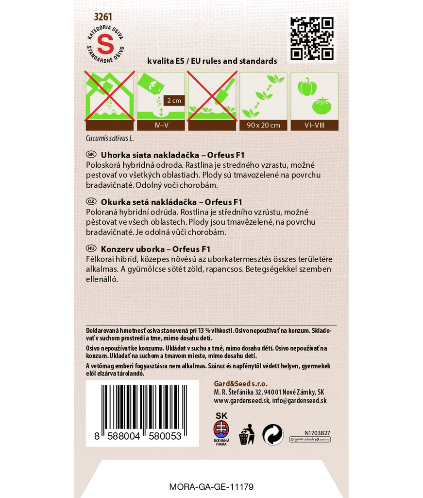 Frukterna är mörkgröna med tydligt knottrig yta och håller jämn kvalitet, vilket gör dem väl lämpade för inläggning och annan förädling. Orfeus F1 är dessutom motståndskraftig mot flera vanliga sjukdomar, vilket bidrar till friskare plantor och stabil produktion.