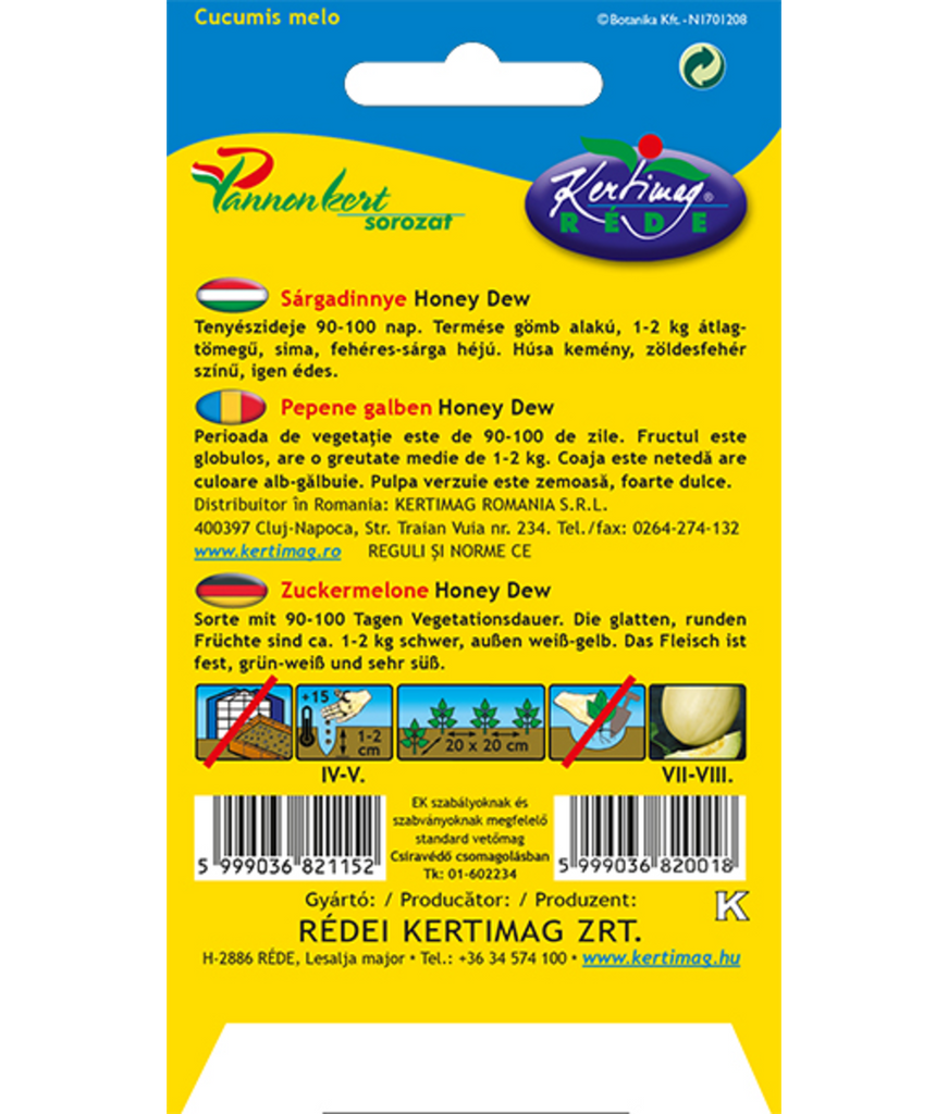 Honungsmelon Honey Dew (Cucumis melo) är en välkänd och uppskattad melonsort med en utvecklingstid på cirka 90–100 dagar. Sorten ger runda, jämnstora frukter med en genomsnittlig vikt på 1–2 kg och passar utmärkt för odling i varma lägen eller i växthus.
