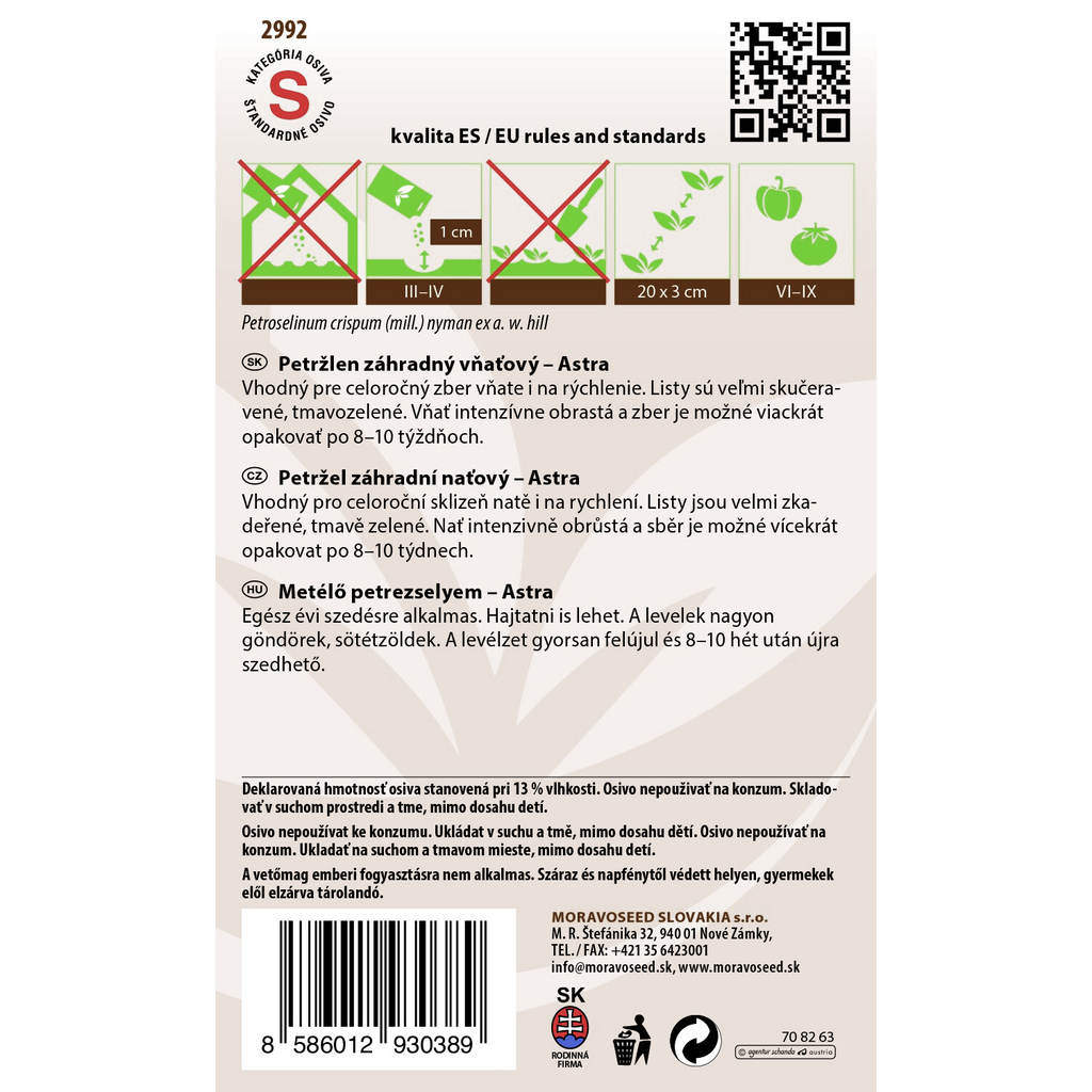 Kruspersilja Astra (Petroselinum crispum) är en högkvalitativ sort med mörkgröna, tätt krusiga blad som ger en fin och fräsch smak till rätter. Den passar för odling året runt och kan även drivas inomhus, vilket gör den till ett perfekt val för både trädgård och köksfönster.