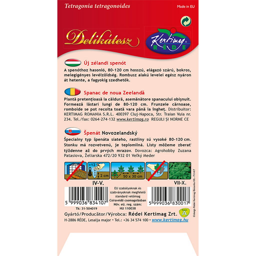 Nyzeeländsk spenat (Tetragonia tetragonoides) är en värmekrävande bladgrönsak med krypande stjälkar som kan bli upp till 120 cm långa. Växten har rombformade blad som kan skördas kontinuerligt från sommaren fram till den första frosten. Den är lätt att odla och används på samma sätt som vanlig spenat i matlagning, men är mer torktolerant och kräver mindre bevattning. Perfekt för varma klimat, och den ger en lång skördeperiod.
