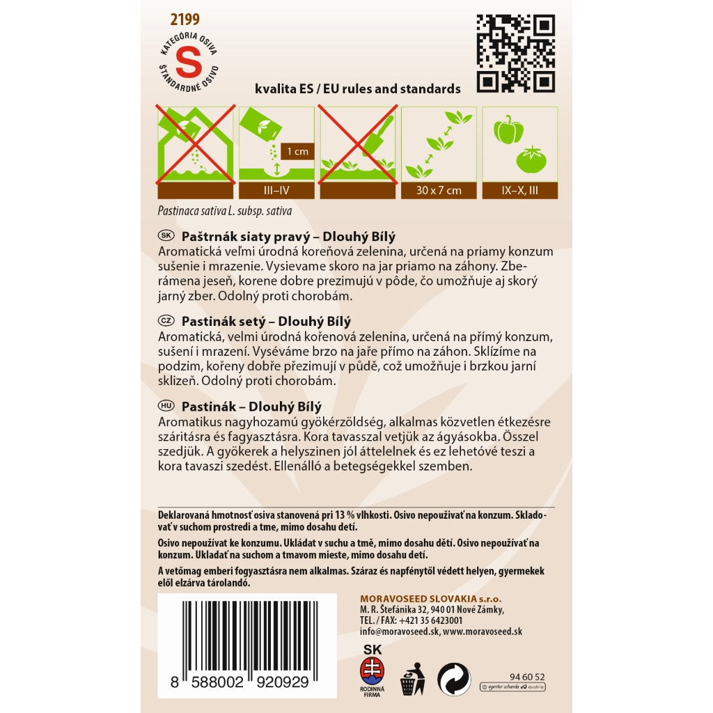 Palsternacka Long White (Pastinaca sativa L.) är en aromatisk och högavkastande rotfrukt som passar utmärkt för färsk konsumtion, torkning och frysning. Denna mångsidiga rotfrukt sås på våren direkt i bäddarna och skördas på hösten. Palsternackans rötter kan även övervintra på växtplatsen för en tidig vårskörd, vilket gör den till ett pålitligt och hållbart val för din trädgård.