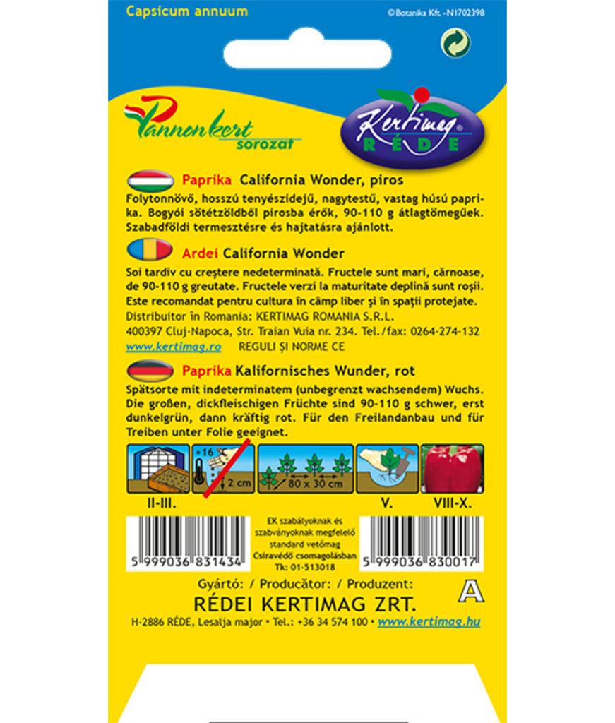 Paprika California Wonder röd (Capsicum annuum) är en välkänd och uppskattad paprikasort med kraftigt växtsätt och lång utvecklingstid. Sorten ger stora, köttiga frukter med tjockt fruktkött och jämn kvalitet, vilket gör den populär både bland hobbyodlare och yrkesodlare.