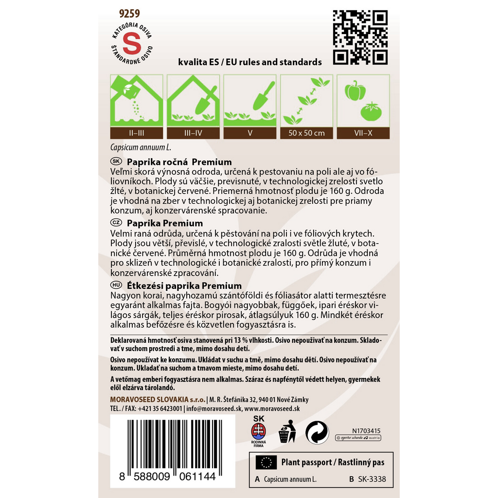 Odlingstips: För bästa resultat, odla Paprika Premium i ett soligt läge med väldränerad jord. Den trivs på både friland och under täckning. Regelbunden vattning och näring under fruktens utveckling säkerställer en hög och kvalitativ skörd. Paprikan mognar snabbt, vilket gör den perfekt för en tidig skörd av högkvalitativa frukter.
