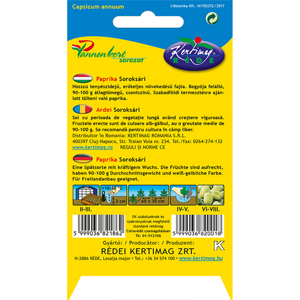 Frö till Paprika Soroksári (Capsicum annuum L.) är en långsäsongssort med kraftig tillväxt som trivs bäst på friland. Denna vit paprika producerar upp till 90–100 g stora, upprättväxande frukter med en krämvit färg och en söt smak. Denna mångsidiga paprika är idealisk för att fyllas, grillas eller användas i matlagning. Paprika Soroksári är perfekt för de som söker en robust sort som tål de flesta väderförhållanden och ger en riklig skörd.