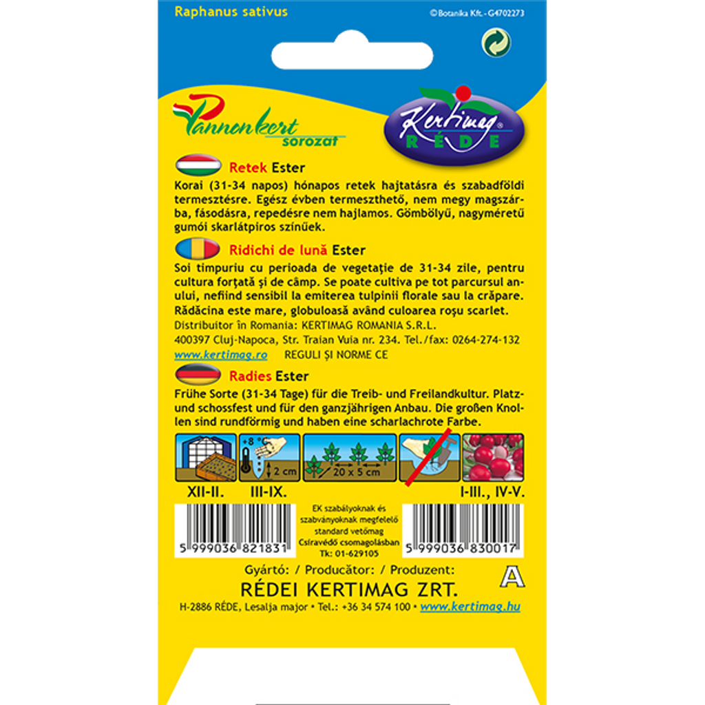 Rädisa Ester (Raphanus sativus) är en tidig sort med en växttid på 31–34 dagar som passar för både växthus och frilandsodling. Denna mångsidiga rädisa kan odlas året runt och är resistent mot blomning, träighet och sprickbildning, vilket gör den till ett pålitligt val för kontinuerlig skörd.
