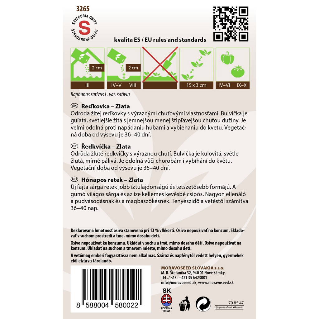 Rädisa Zlata (Raphanus sativus) är en unik och vacker rädisa med gyllene gula knölar och en mild, behaglig smak. Perfekt för dig som söker en ovanlig och dekorativ rädisa med mindre skarphet, idealisk för både trädgårdsodling och sallader. Denna sort är särskilt motståndskraftig mot träighet och tidig blomning, vilket gör den till ett pålitligt val för en långvarig skörd.