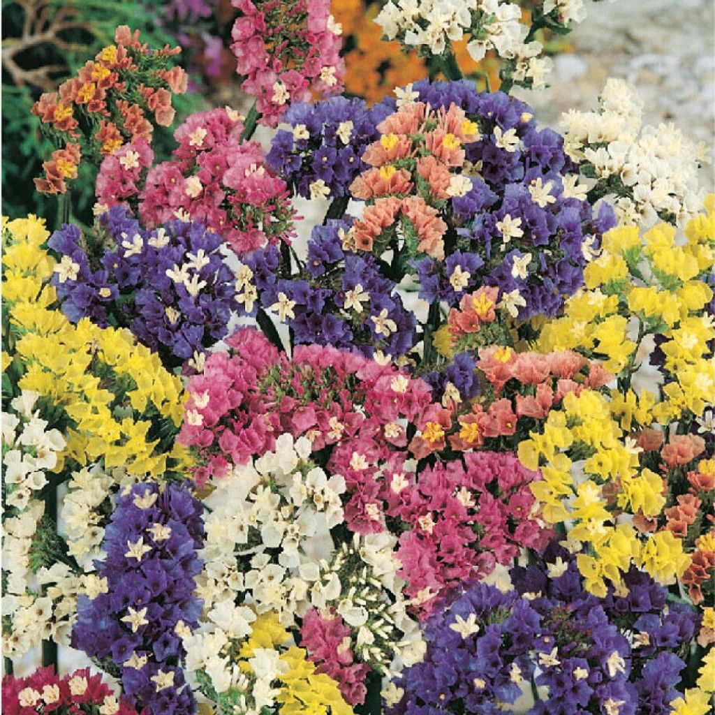 Risp Färgmix (Limonium sinuatum) är en ettårig blomma som är särskilt uppskattad för sin hållbarhet – både färsk och torkad. Den producerar färgstarka blomklasar som är perfekta för snitt och torkning. Klipp stjälkarna i full blom och häng dem upp och ner på en mörk, luftig plats för långvariga dekorationer.