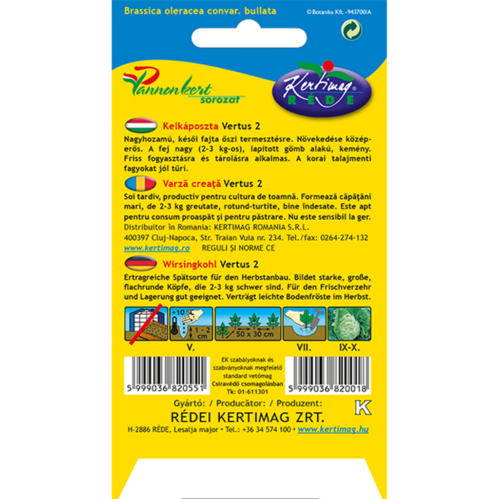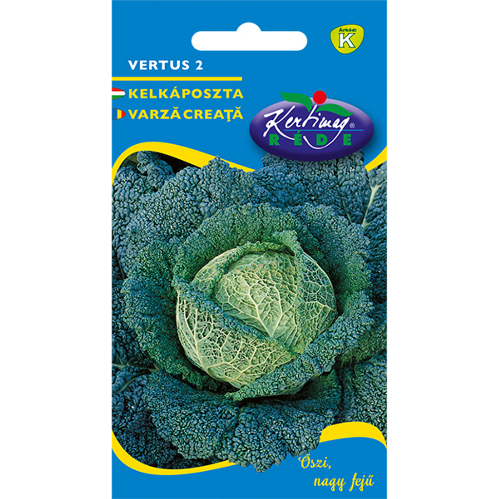 Savoykål Vertus 2 (Brassica oleracea convar. bullata) är en högavkastande, sen sort som är perfekt för höstodling. Plantorna har medelstark tillväxt och producerar stora, plattrunda kålhuvuden som väger 2–3 kg. Huvudena är täta och hårda, vilket gör denna sort idealisk för både färsk konsumtion och lagring. Den är särskilt bra för odlare som söker en tålig och högkvalitativ savoykål som klarar tidiga markfroster väl.
