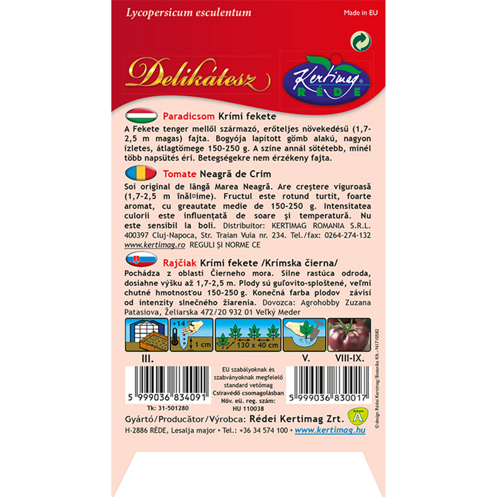 Frö till Svart tomat Noire de Crime (Solanum lycopersicum L.) är en kraftigväxande och högavkastande tomatsort som ger stora, platt-runda frukter med en intensiv smak. Dessa mörkare tomater får sin karaktäristiska färg genom att exponeras för rikligt med solljus. Med en växtstorlek på 1,7–2,5 meter är denna sort perfekt för trädgårdar där du söker en robust tomat med både smak och visuellt intryck.