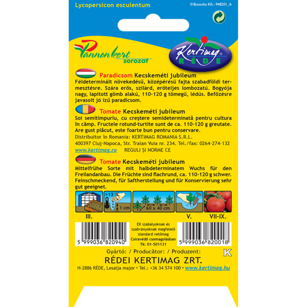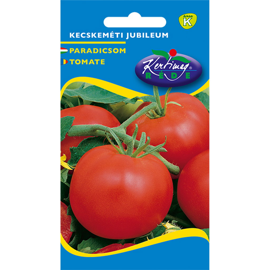 Tomat Kecskeméti Jubileum (Solanum lycopersicum L.) är en robust, medelmogen tomatsort som passar perfekt för frilandsodling. Denna halvhöga sort har en stark och solid stjälk med en kraftig bladmassa, vilket gör den både tålig och motståndskraftig. De stora, platt-runda tomaterna väger mellan 110–120 g och har en saftig och god smak som gör dem till ett utmärkt val för konservering.