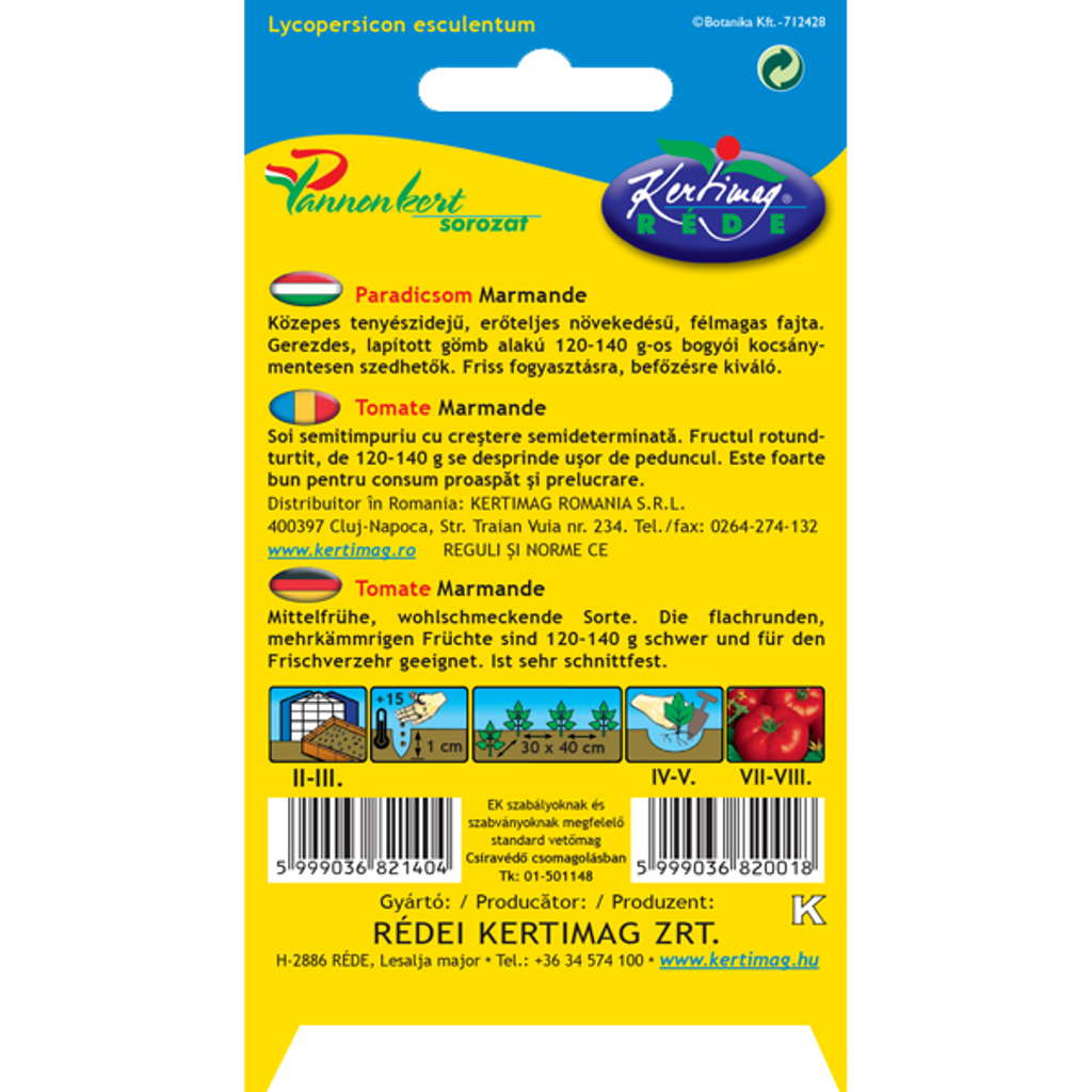 Tomat Marmande (Solanum lycopersicum L.) är en medelmogen determinant tomatsort som kännetecknas av sin kraftiga tillväxt och hög avkastning. De segmenterade och platt-runda tomaterna väger mellan 120–140 g och har en utmärkt smak, vilket gör dem perfekta för både färsk konsumtion och konservering. Marmande är känd för sin mångsidighet och förmåga att leverera stora, saftiga tomater som kan användas i sallader, såser, inläggningar och andra rätter.