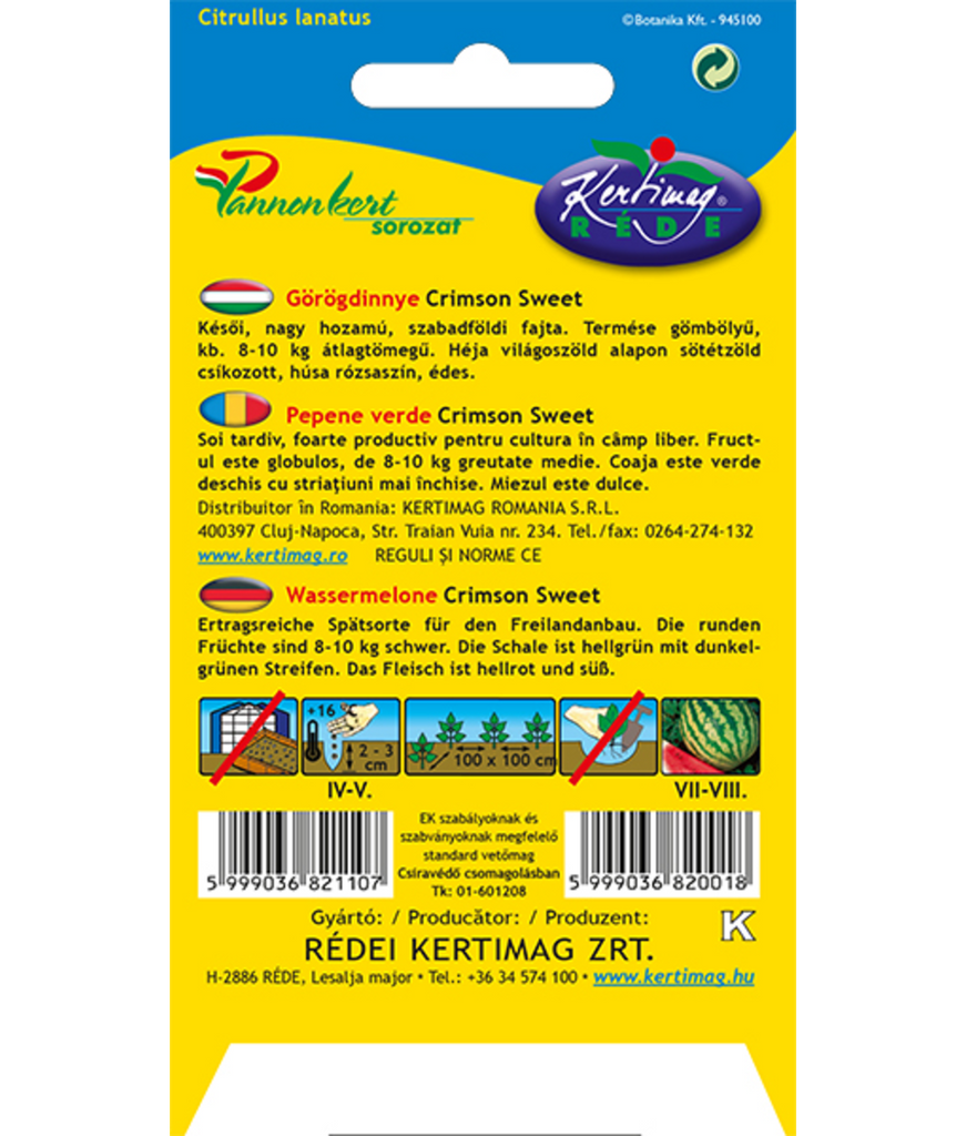 Vattenmelon Crimson Sweet (Citrullus lanatus) är en sen, högavkastande sort som är särskilt lämpad för frilandsodling under varma och soliga förhållanden. Sorten är känd för sin pålitliga skörd och sina stora, jämnt formade frukter.