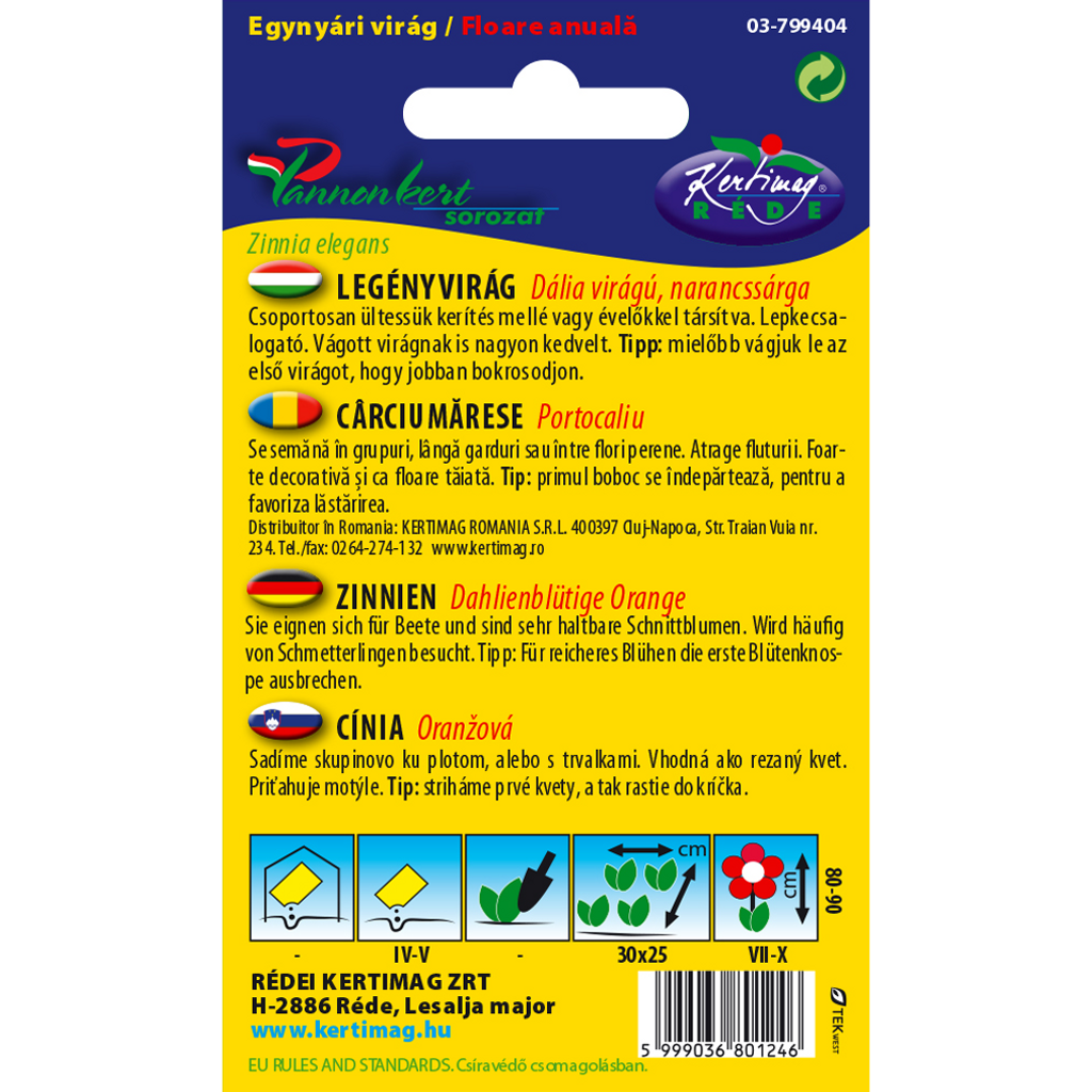 Zinnia Orange Dahlia (Zinnia elegans) är en livfull blomma som ger trädgården ett intensivt orange färgspektrum. Den är särskilt lockande för fjärilar och blir ännu buskigare om du klipper bort den första blomman tidigt. Perfekt för att plantera i grupper vid staket eller i kombination med perenner för en fantastisk visuell effekt.